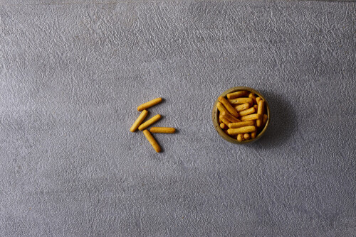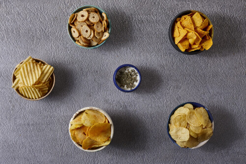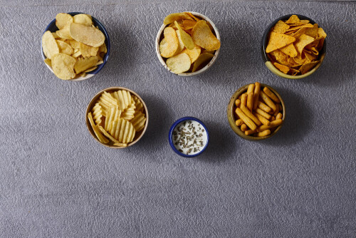 وجبات خفيفة متنوعة في أوعية فخارية على خلفية رمادية
