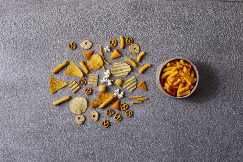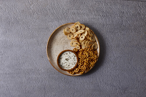 وجبات خفيفة متنوعة في أوعية فخارية على خلفية رمادية