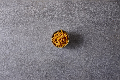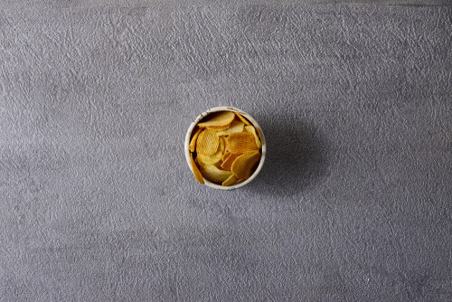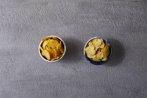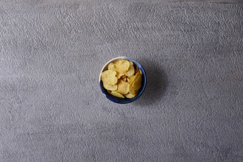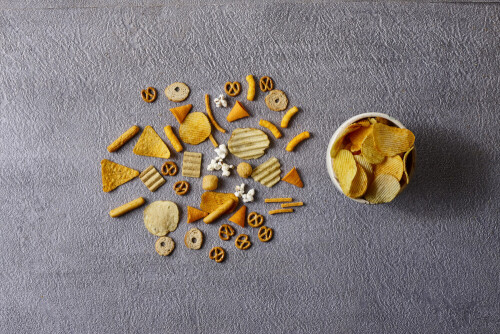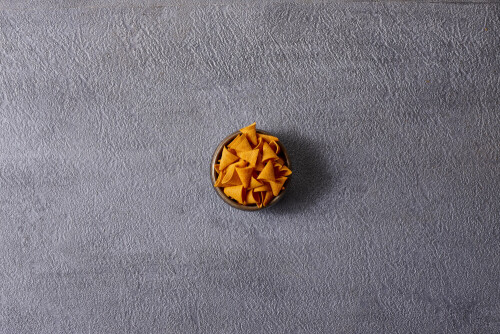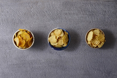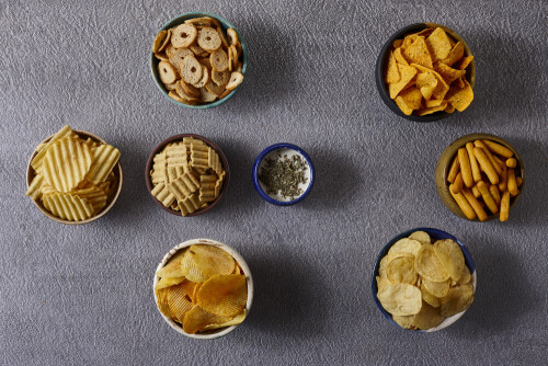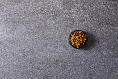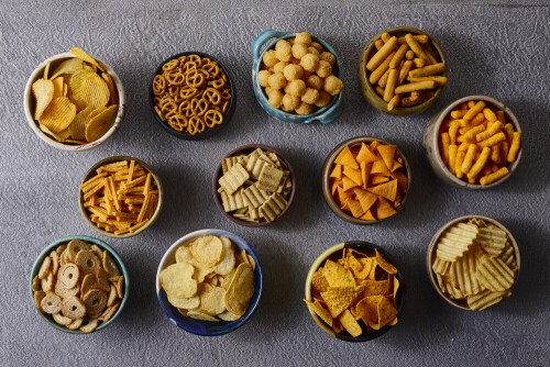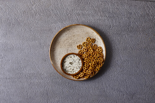 وجبات خفيفة متنوعة في أوعية فخارية على خلفية رمادية