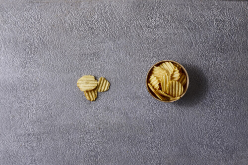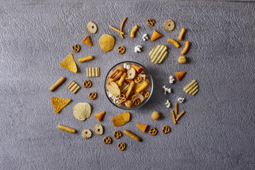 وجبات خفيفة متنوعة في أوعية فخارية على خلفية رمادية