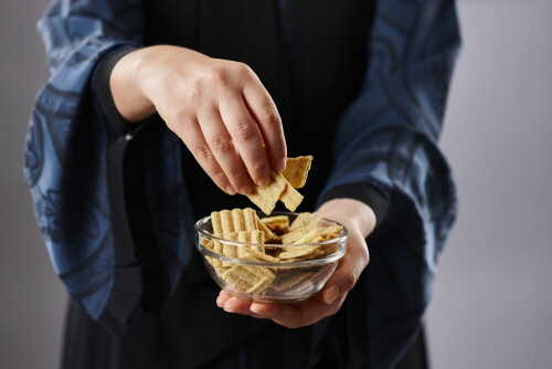 امرأة ترتدي عباءة تحمل أنواع مختلفة من الوجبات الخفيفة في أوضاع متعددة