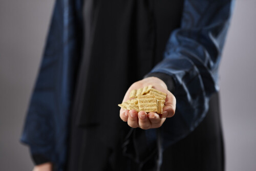 امرأة ترتدي عباءة تحمل أنواع مختلفة من الوجبات الخفيفة في أوضاع متعددة