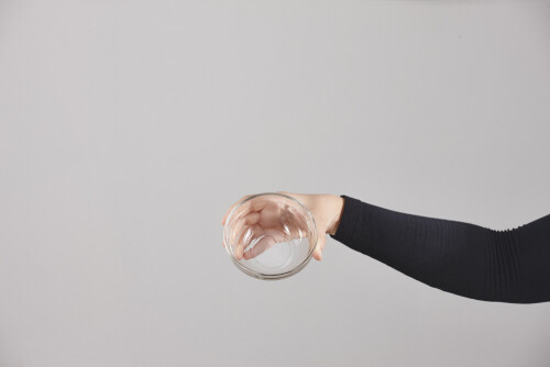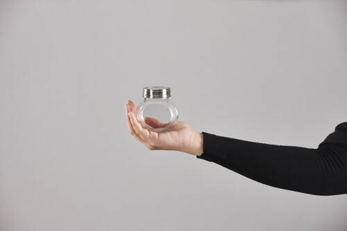 امرأة ترتدي عباءة سوداء تحمل أدوات زجاجية مختلفة في أوضاع متعددة