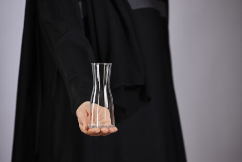 امرأة ترتدي عباءة سوداء تحمل أدوات زجاجية مختلفة في أوضاع متعددة