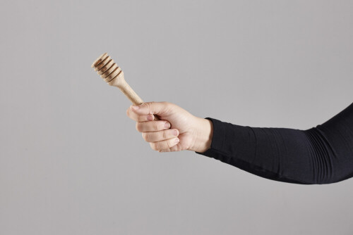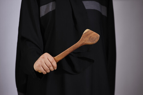 امرأة ترتدي عباءة سوداء تحمل أدوات خشبية مختلفة في أوضاع متعددة