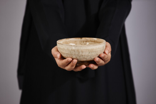 امرأة ترتدي عباءة سوداء تحمل أدوات فخارية مختلفة في أوضاع متعددة