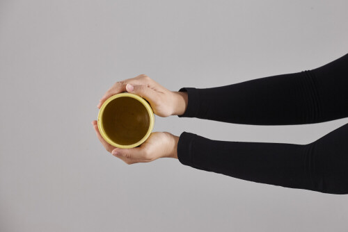 امرأة ترتدي عباءة سوداء تحمل أدوات فخارية مختلفة في أوضاع متعددة