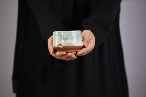 امرأة ترتدي عباءة سوداء تحمل أدوات فخارية مختلفة في أوضاع متعددة