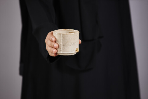 امرأة ترتدي عباءة سوداء تحمل أدوات فخارية مختلفة في أوضاع متعددة
