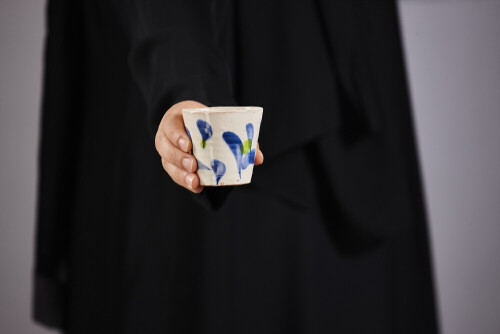 امرأة ترتدي عباءة سوداء تحمل أدوات فخارية مختلفة في أوضاع متعددة