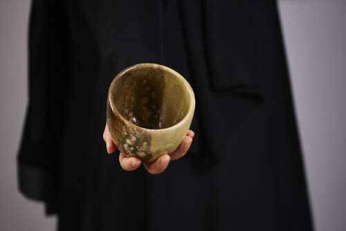 امرأة ترتدي عباءة سوداء تحمل أدوات فخارية مختلفة في أوضاع متعددة