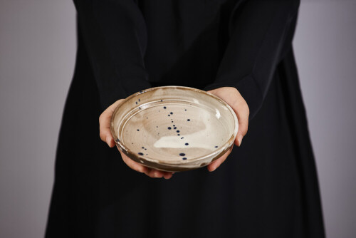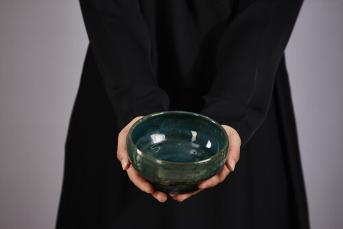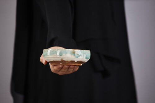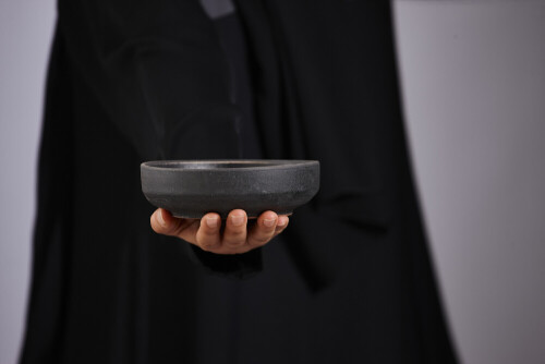 امرأة ترتدي عباءة سوداء تحمل أدوات فخارية مختلفة في أوضاع متعددة