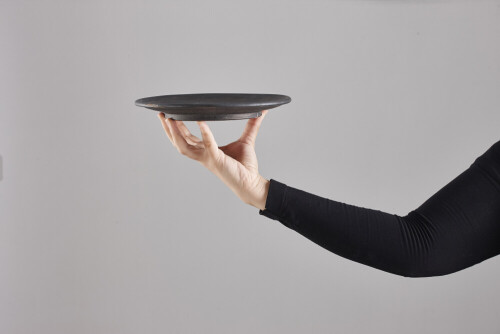 امرأة ترتدي عباءة سوداء تحمل أدوات فخارية مختلفة في أوضاع متعددة