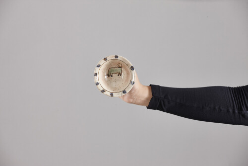 امرأة ترتدي عباءة سوداء تحمل أدوات فخارية مختلفة في أوضاع متعددة