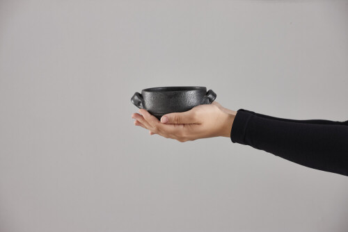 امرأة ترتدي عباءة سوداء تحمل أدوات فخارية مختلفة في أوضاع متعددة