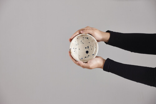 امرأة ترتدي عباءة سوداء تحمل أدوات فخارية مختلفة في أوضاع متعددة