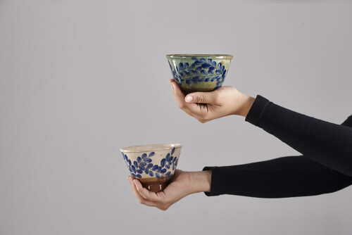 امرأة ترتدي عباءة سوداء تحمل أدوات فخارية مختلفة في أوضاع متعددة