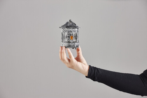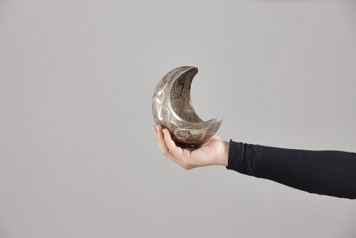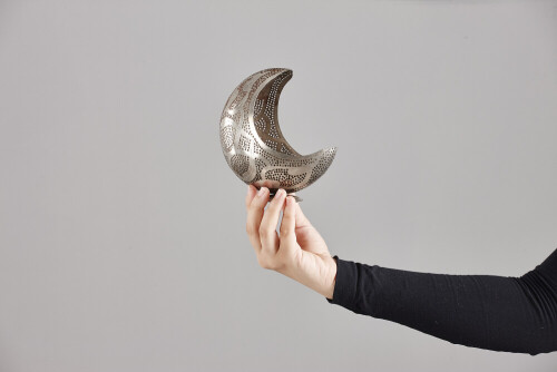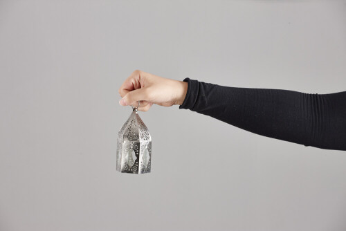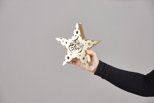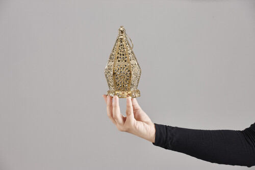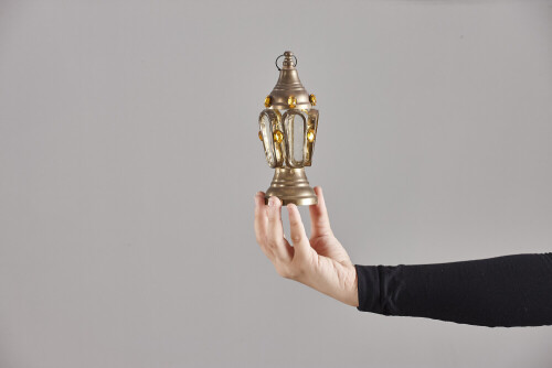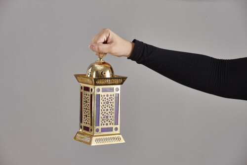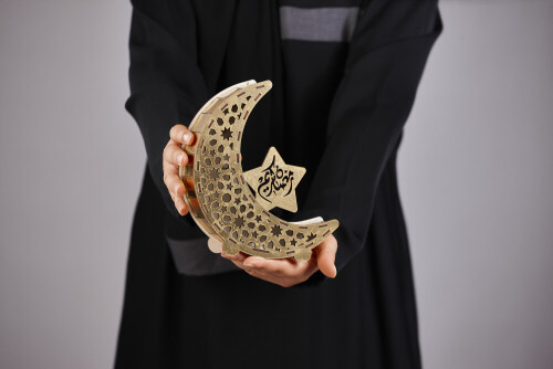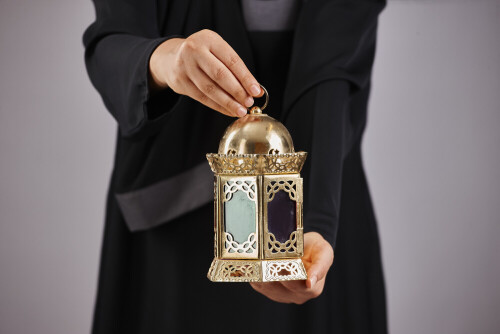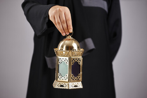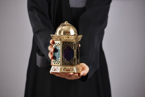 امرأة ترتدي عباءة سوداء تحمل فوانيس رمضانية مختلفة في أوضاع متعددة