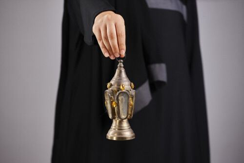 امرأة ترتدي عباءة سوداء تحمل فوانيس رمضانية مختلفة في أوضاع متعددة