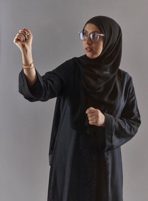 امرأة ترتدي عباءة سوداء وحجاب ونظارة وتمسك بقلم للكتابة على لوح شفاف مع ردود فعل وتعبيرات مختلفة على خلفية رمادية