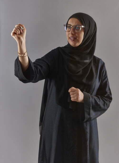 امرأة بالعباءة تكتب على لوح شفاف