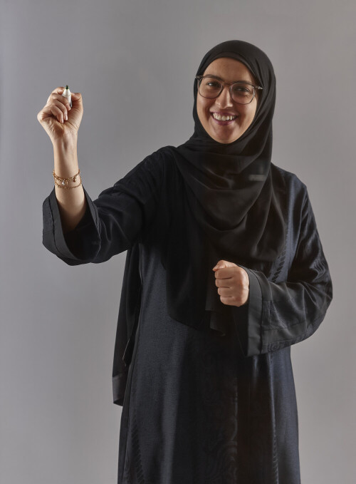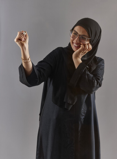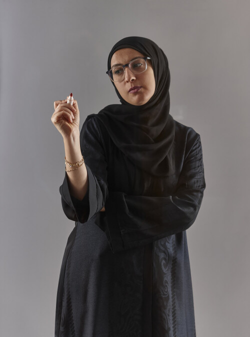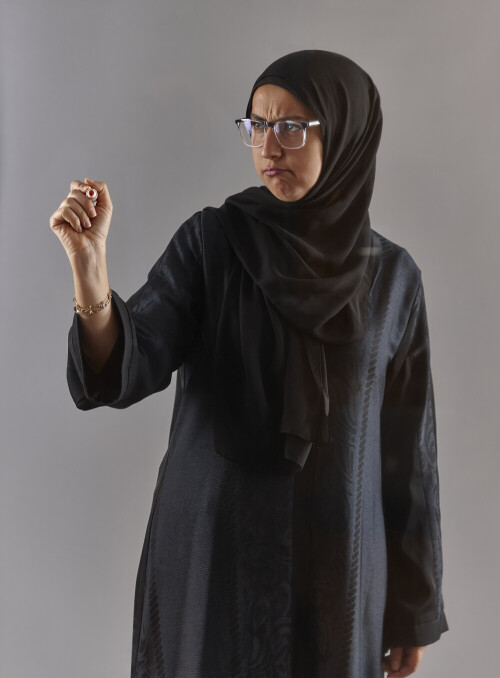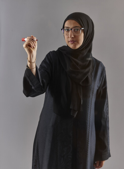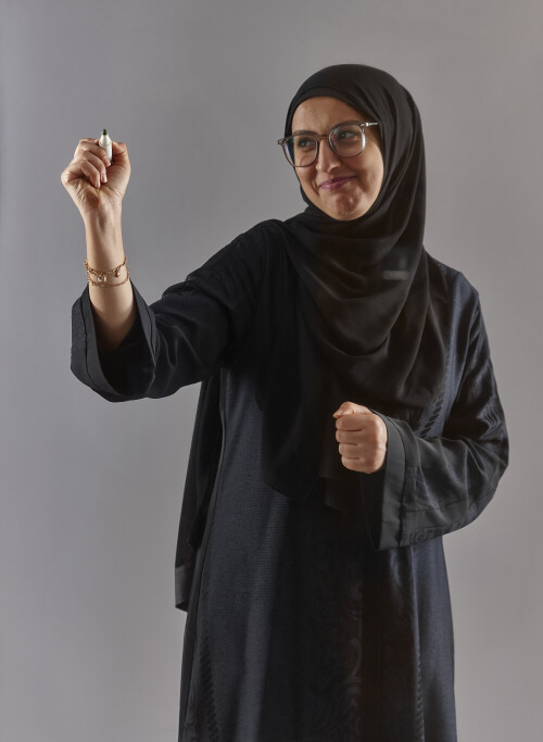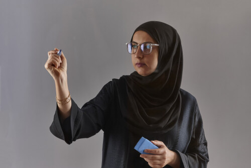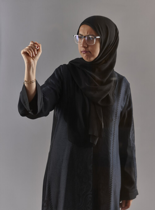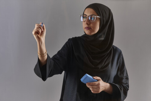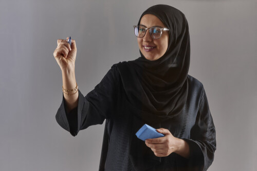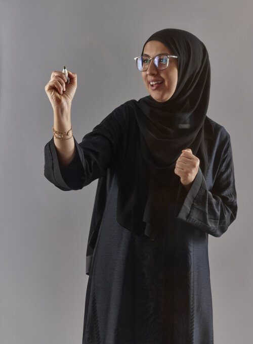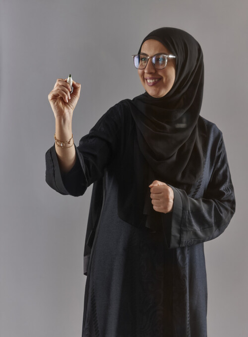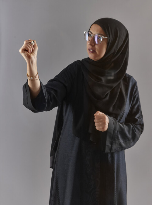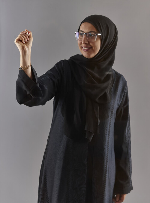 امرأة بالعباءة تكتب على لوح شفاف