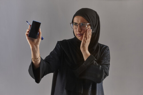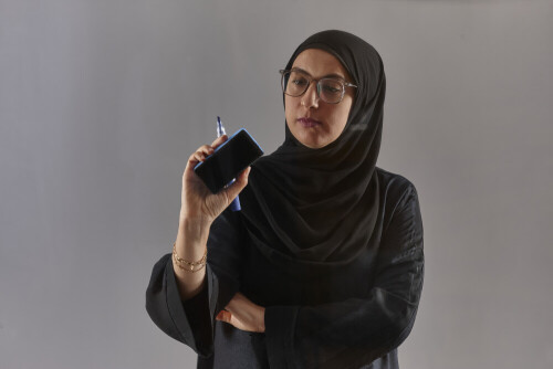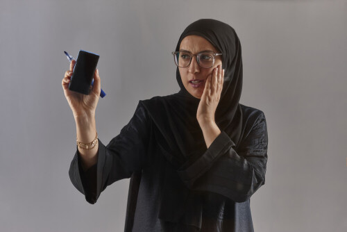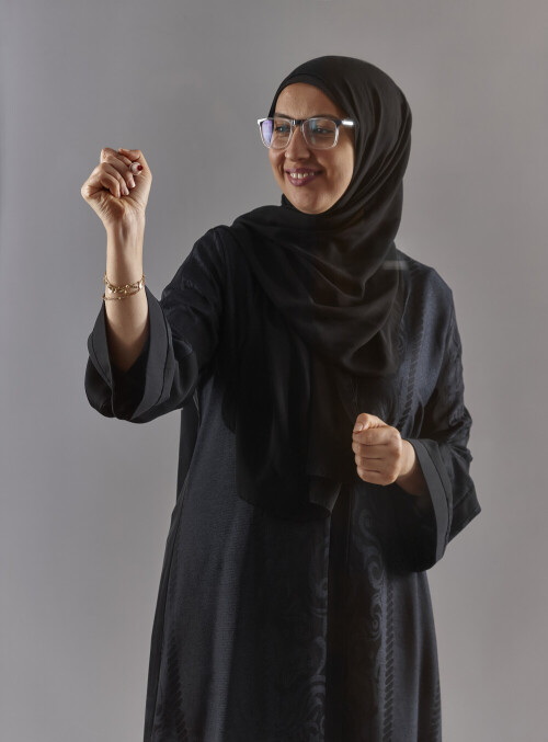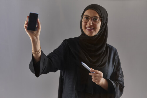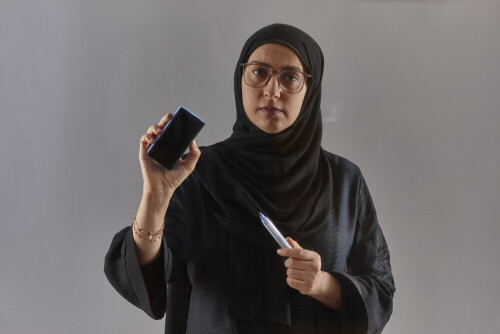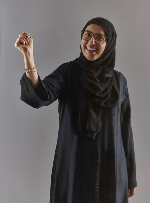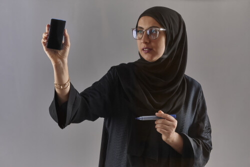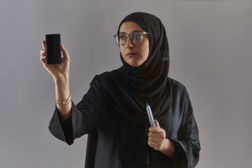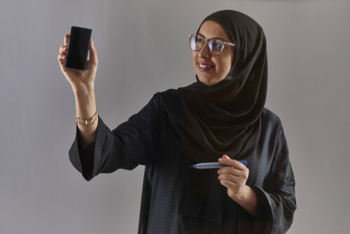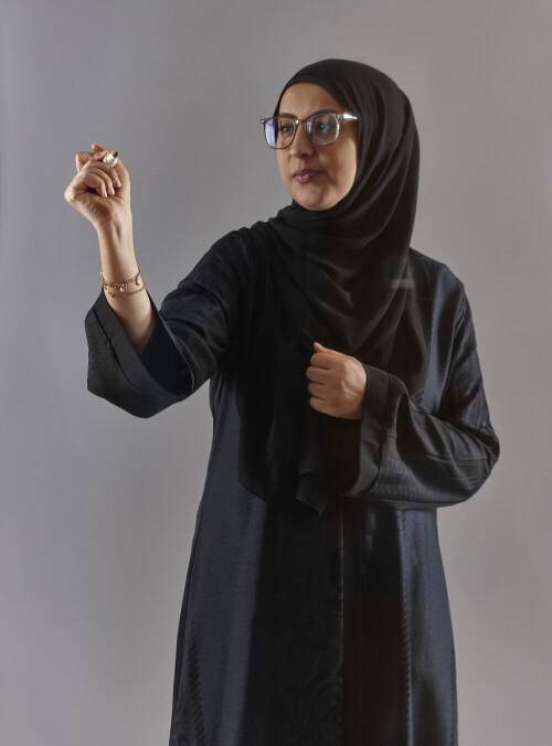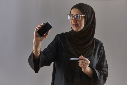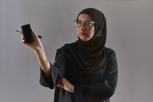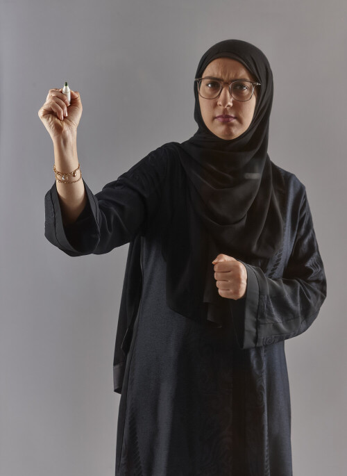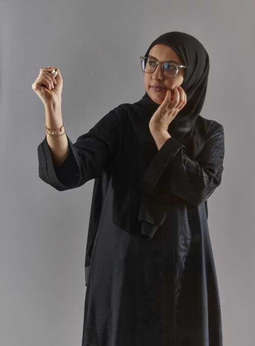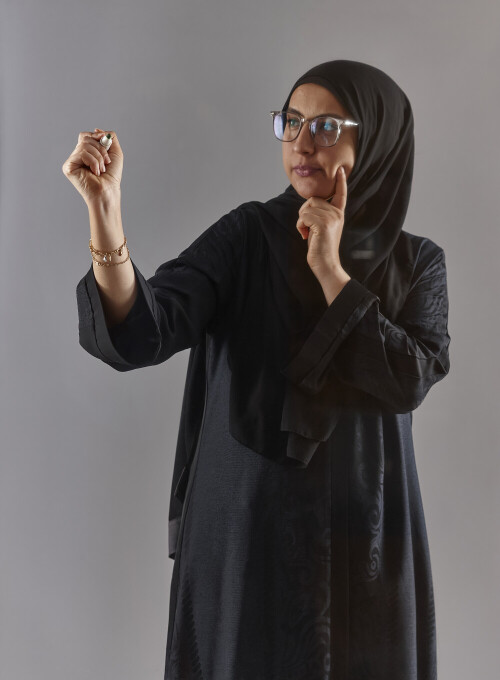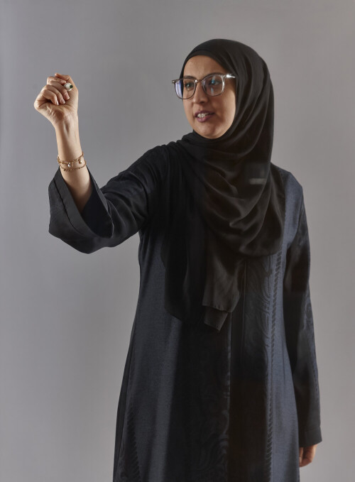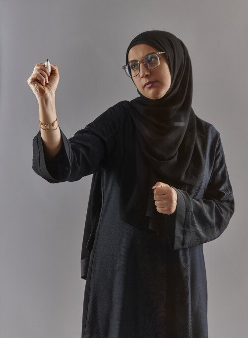 امرأة بالعباءة تكتب على لوح شفاف