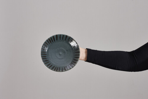 multi-colored pottery Plate placed on a small light colored straw placemat