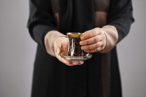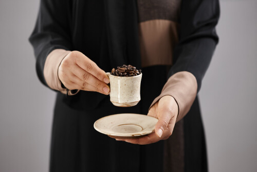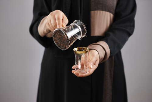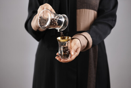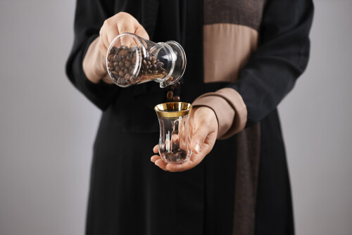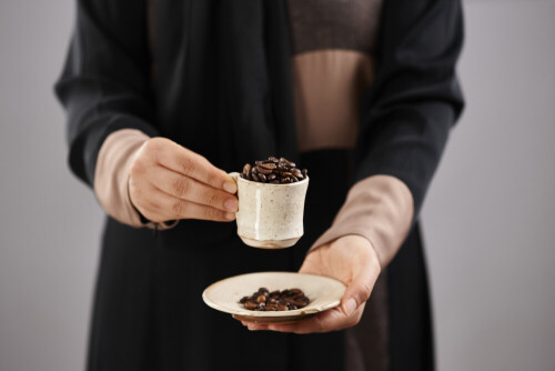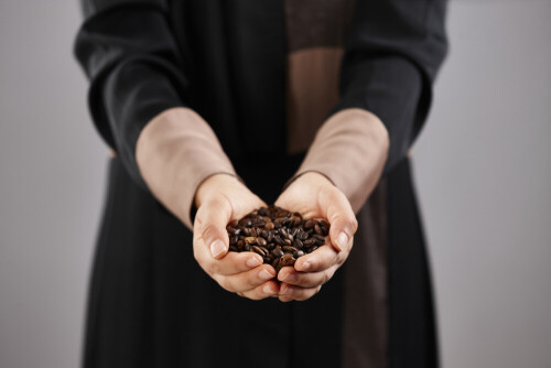 Woman in abaya holding different kinds of coffee beans in different positions