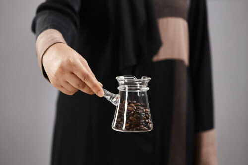 Woman in abaya holding different kinds of coffee beans in different positions