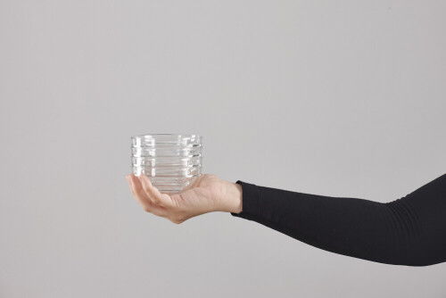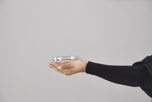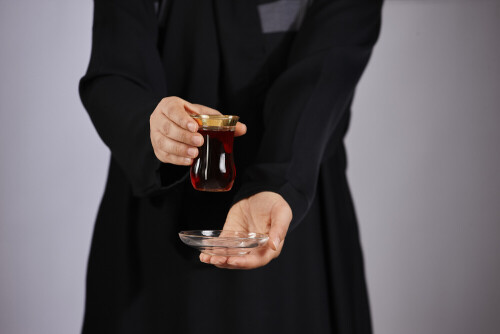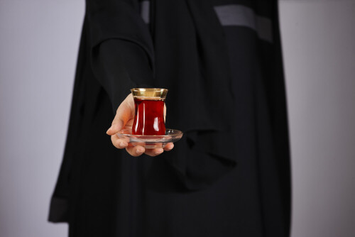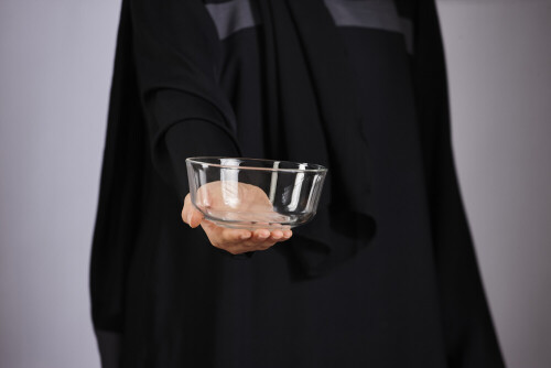 A woman in black abaya holding different glassware in different positions