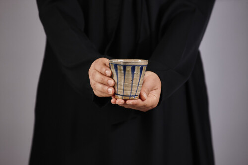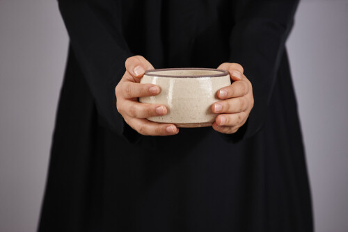 A woman in black abaya holding different pottery essentials in different positions