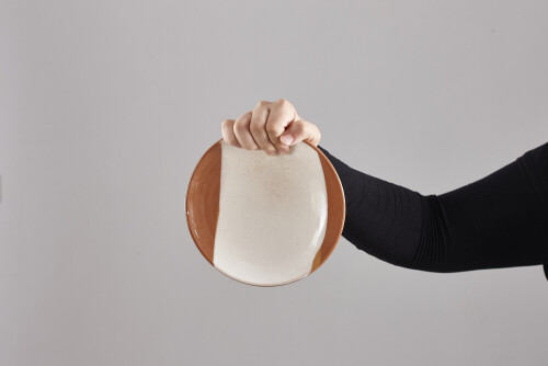 A woman in black abaya holding different pottery essentials in different positions