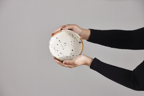 A woman in black abaya holding different pottery essentials in different positions