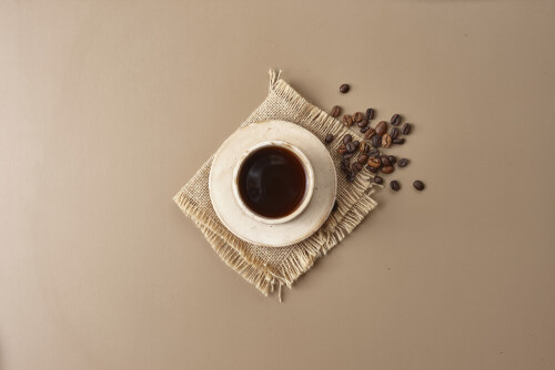 A beige pottery cup of coffee surrounded by roasted coffee beans on beige background