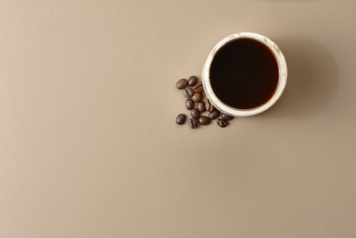A beige pottery cup of coffee surrounded by roasted coffee beans on beige background