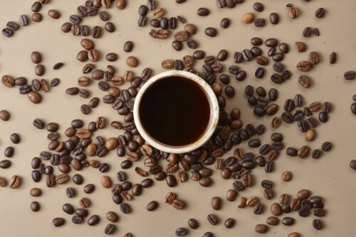A beige pottery cup of coffee surrounded by roasted coffee beans on beige background