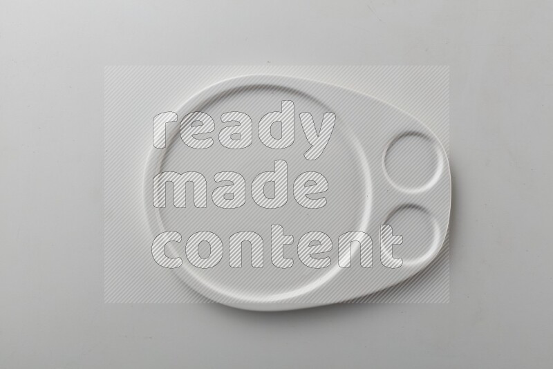 Top-view shot of an irregular white plate on white background