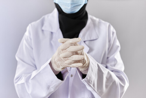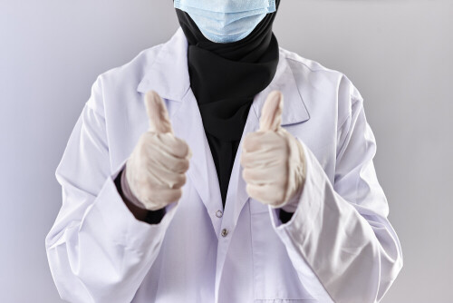Female doctor wearing an abaya and medical attire in different positions