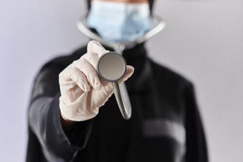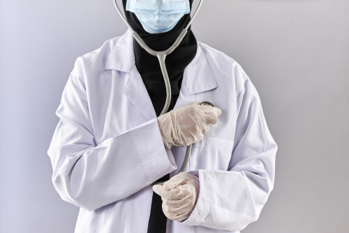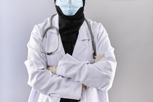 Female doctor wearing an abaya and medical attire in different positions