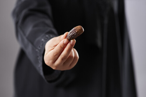 Woman in abaya holding dates in different positions