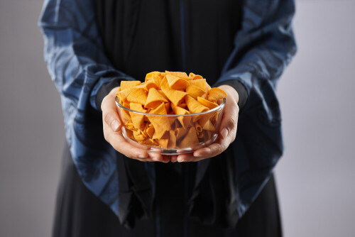 Woman in abaya holding different kinds of snacks in different positions