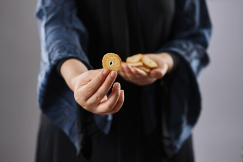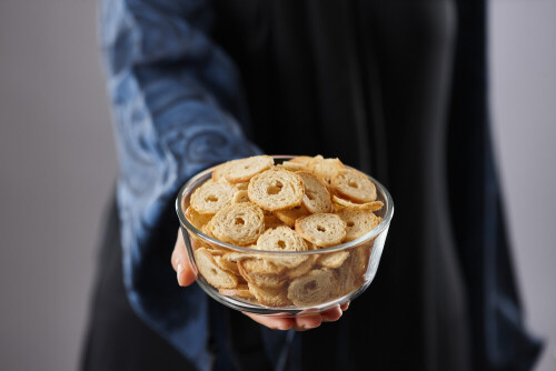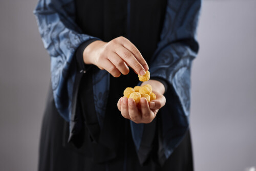 Woman in abaya holding different kinds of snacks in different positions