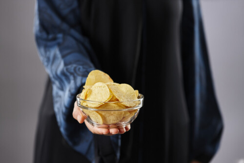 Woman in abaya holding different kinds of snacks in different positions