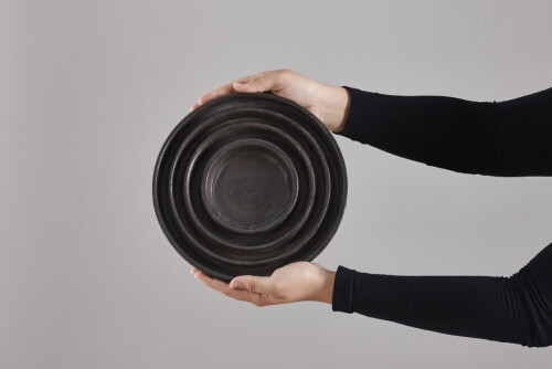 A woman in black abaya holding different pottery essentials in different positions
