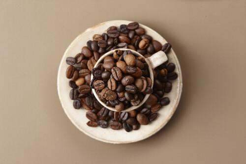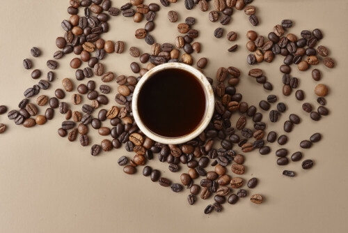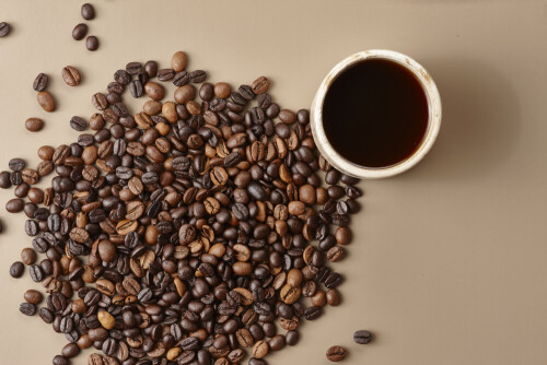 A beige pottery cup of coffee surrounded by roasted coffee beans on beige background