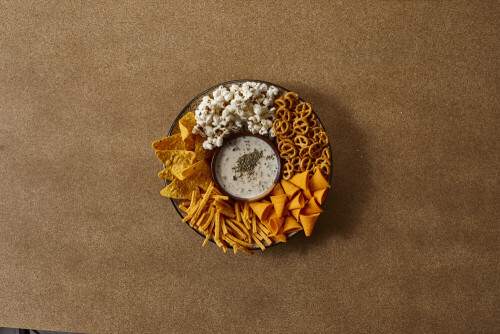 multi-colored pottery Plate placed on a small light colored straw placemat