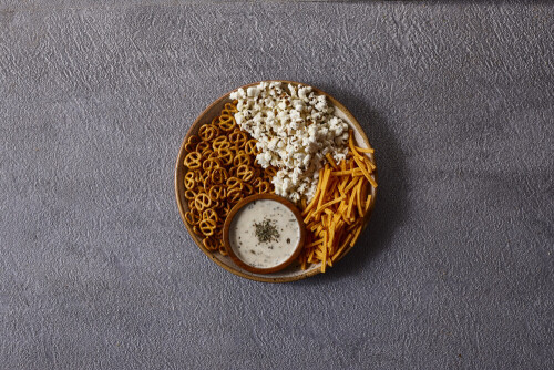 وجبات خفيفة متنوعة في أوعية فخارية على خلفية رمادية