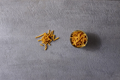 وجبات خفيفة متنوعة في أوعية فخارية على خلفية رمادية