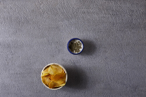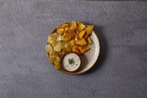 وجبات خفيفة متنوعة في أوعية فخارية على خلفية رمادية